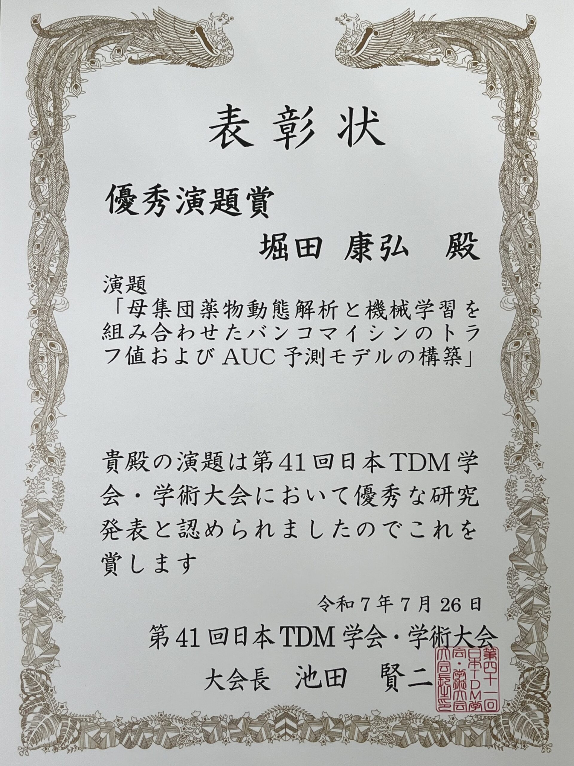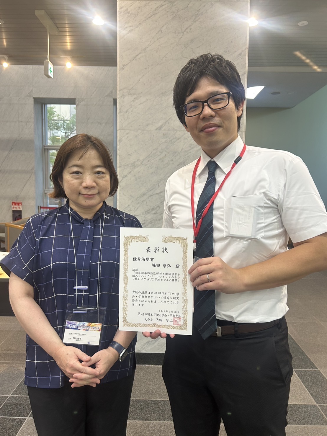 臨床薬剤学分野 講師の堀田康弘先生が、第41回日本TDM学会・学術大会で優秀演題賞を受賞しました。